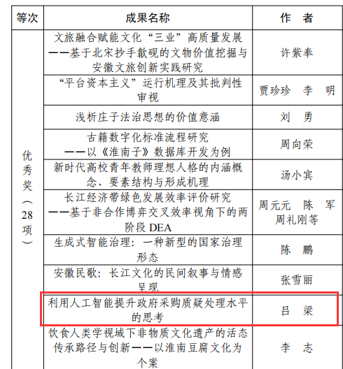 近日,由安徽省社会科学界联合会组织评选的2025年度“三项课题”研究活动优秀成果名单揭晓,我公司吕梁同志撰写的 《利用人工智能提升政府采购质疑处理水平的思考》 一文,荣获 “优秀奖”。