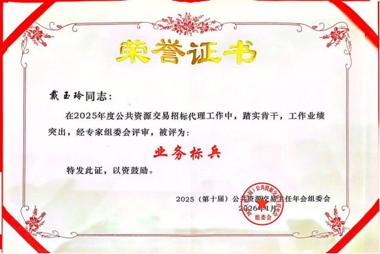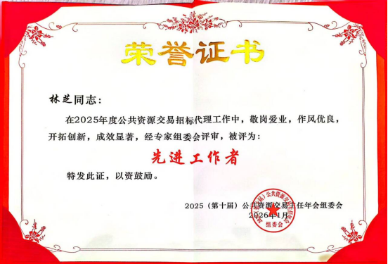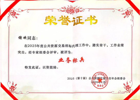 捷报频传,载誉前行!2026年1月20日,2025(第十届)公共资源交易主任年会在湖北武汉隆重召开,兴马公司凭借深厚的行业沉淀、强劲的综合实力与卓越的市场口碑,再次成功获评“2025年公共资源交易综合竞争力百强代理机构”,多名职工分获不同表彰:林芝同志获“2025年公共资源交易代理机构先进工作者”称号,谢欢和戴玉玲两位同志获“2025年公共资源交易代理机构业务标兵”称号,实现集体荣誉与个人表彰“双丰收”。